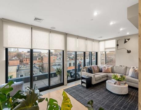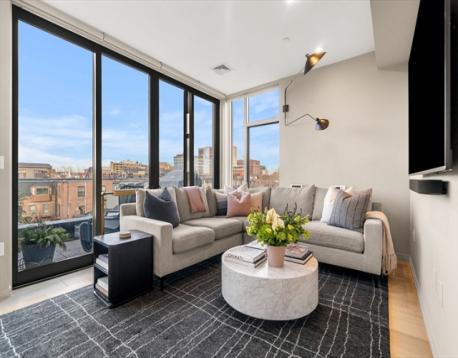Experience luxury and convenience in this stunning penthouse, located in a boutique building built in 2018. This single-floor residence offers direct elevator access and breathtaking 360-degree views of the Back Bay skyline. The modern kitchen features sleek Miele appliances, custom cabinetry, and a spacious island. Expansive windows fill the open-concept living and dining areas with natural light, highlighting the elegant hardwood floors. The private master suite boasts a spa-like bath, custom closets, and a secluded terrace, while two additional bedrooms provide flexibility for guests or a home office. The main living space opens to a balcony with a gas grill hookup, perfect for entertaining. Heated garage parking and one secured outdoor parking space, 2 parking spaces total—all in a boutique building with low condo fees. The sellers have also obtained approved permits to build a private roof deck, adding even more exclusive outdoor space.