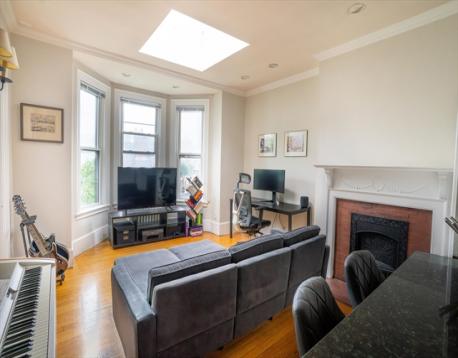 Fantastic front facing, top floor one bedroom condo in a quintessential Back Bay Brownstone. Prime location close to all of the shops and restaurants of Newbury Street, Prudential Center, the Public Garden, and the Charles River. City living at its best! Open layout, high ceilings, skylight, fireplace, and bay windows with city views! Bright and sunny with excellent use of space. In unit laundry and fully applianced kitchen with island. Gleaming wood floors, period details including crown molding. Professional managed, pet friendly building. Common roof deck with beautiful Boston views.