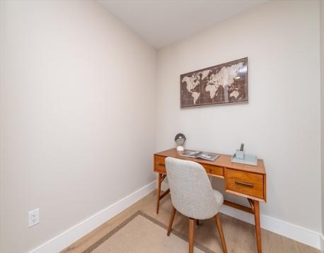 THIS LOFT IS AWESOME! Located in a converted 1890’s Queen Anne building dubbed Allston Hall, with easy access to Harvard + BU, this top floor loft has two levels of living space and 18' ceilings! An entry foyer leads to a dramatic open floorplan living, dining + kitchen area with distinct Palladian windows. Finishes throughout have a crisp + modern feel w/engineered oak floors and a contemporary white + gray kitchen w/Bosch appliances and a large seating island. The bathroom boasts large format wall tiles, hexagon floor tiles, a soaking tub + matte black Kohler fixtures. There is also an office nook on this floor. Upstairs is a spacious mezzanine level bedroom overlooking the floor below. It features a walk-in closet + laundry. The building has an elevator + rental parking included for the first year. Conveniently located near everything that Allston has to offer including the T, shopping, restaurants and more. ONE OF ONLY TWO UNITS REMAINING!