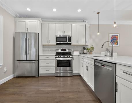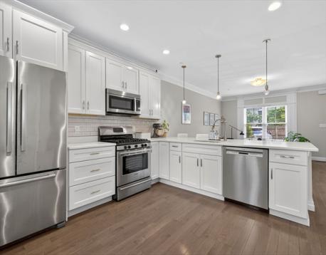 Tucked away on a quiet dead-end just steps from Oak Square, this stunning 3-bed, 2.5-bath Brighton townhome offers 3 levels of thoughtfully designed living. The open-concept main floor features a bright living room with bay windows, a modern kitchen with granite counters, stainless appliances, pantry, and a central island—ideal for entertaining. Upstairs, find two spacious bedrooms, a full bath, and laundry. The third level boasts a private primary suite with walk-in closet and en suite bath. Hardwood floors, central air, recessed lighting, and a full unfinished basement offer comfort and potential. Includes 2 deeded off-street parking spaces. Pet-friendly and professionally managed 5-unit association with low HOA. Easy access to shops, parks, and public transit.