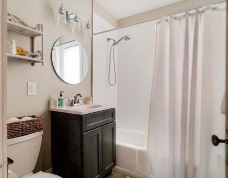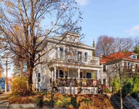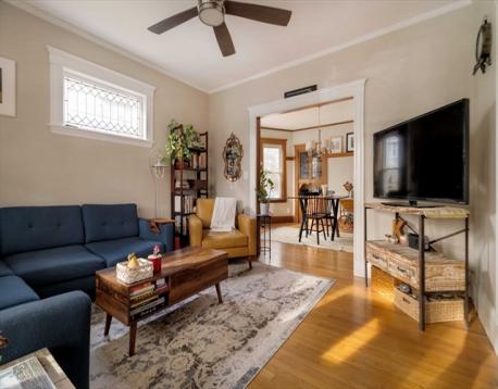 Bright 2 bed, 1 bath condo in 2-unit bldg in Roslindale’s Lower Bellevue Hill. Elevated 1st floor unit (on corner lot) offers unobstructed SW exposure along Cornell side—sunlight fills the LR, DR, and kitchen all day. The covered front deck is a dream on summer's eve. Entry vestibule opens to LR w/ classic leaded glass piano window + original gumwood trim. DR features built-in china cab + wide opening to LR. Kitchen refreshed in 2024: white shaker cabs, butcher block counters, SS apps, direct-vent hood, subway tile. Add'l features: butler’s pantry, rear porch, hw flrs (fir & oak), 2 well-sized beds, tiled bath. Private basement area + shared garage for bikes/gear. Easy on-st pkg, esp. along Cornell. Pet-friendly 2-unit assoc. Close to both Rozzie Sq (1/2 mile) + West Roxbury's Centre (.6 mile) Minutes from Stonybrook Rez, Bellevue Tower, and only 1 mile from Arborteum's Peters Hill Gate . A sunny, character-rich home in a simple, well-kept assoc.