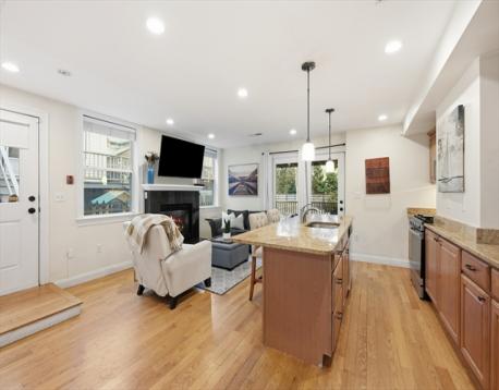This thoughtfully designed, floor-through unit offers a private entrance and the perfect balance of modern comfort and long term value. The open concept layout is anchored by an oversized kitchen island, granite countertops, and stainless steel appliances, creating an ideal space for everyday living and entertaining. The living area features a gas fireplace and opens through glass doors to a private, covered patio overlooking a large fenced-in backyard. Two generously sized bedrooms offer excellent closet space and abundant natural light. The bathroom includes a jetted tub and tile flooring. Additional highlights include a new water heater, in-unit washer and dryer, hardwood floors throughout, central air conditioning, gas heating and cooking, and recessed lighting. Ideally located near Castle Island, with easy access to dining, shopping, public transportation, and the best of South Boston, this condo offers strong lifestyle appeal and long-term investment potential.