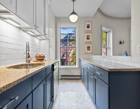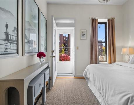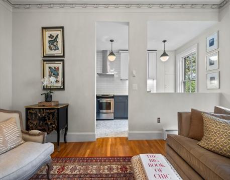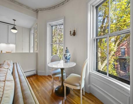 Stylish upper level South End gem! One floor above parlor level, this elegantly renovated floor-through condo blends period character with a modern designer touch. Original plaster moldings and 10-ft ceilings add charm and soul, while thoughtful updates make everyday living effortless. A proper foyer leads to a spacious living and dining room anchored by a marble fireplace and elegant bowfront windows overlooking the tree-lined street. The tastefully renovated kitchen features shaker cabinetry, stainless appliances, under-cabinet lighting, and ample storage. The rear of the home offers 2 spacious bedrooms, including a peaceful primary with access to the private deck, custom-built closets, in-unit laundry, and an updated tiled bath. A private south-facing deck is drenched in light—perfect for coffee, cocktails, or entertaining. This jewel-box home belongs to a well-maintained association with low fees and is moments from the South End’s best dining, boutiques, and parks.