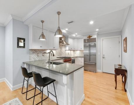 Located moments from Castle Island, this high-end East Side 2 bedroom 2 bathroom condo features an enormous king-size primary bedroom with a Walk-In Closet and En-Suite Bathroom with both a soaking tub and a steam shower. Rare 2 Garage Parking Spaces and Private Storage Room included. The open-concept kitchen features a Wolf range, Sub-Zero refrigerator, significant counterspace, and island seating. The living room centers around a Gas Fireplace with custom built-ins. Off the living room, french doors open to a Private Balcony equipped with a gas line. In-Unit Laundry and an intercom system complete this property. This unit is located on the 2nd floor of a professionally managed elevator building.