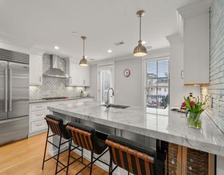 Remarkable corner townhouse in coveted City Point neighborhood! Discover luxury living in this exceptional 3 bed PLUS office/media room, 2.5-bath home with an oversized garage parking space + 2 exterior parking spaces. The open-concept living, kitchen, and dining level is exceptionally designed for both comfort & entertaining, featuring a gas fireplace, Wolf/Sub Zero appliances, double oven, custom inset cabinets, and leads directly out to a beautiful balcony with a plumbed gas line for grilling. Upstairs, the primary suite offers a luxurious retreat, highlighted by 9 foot ceilings, a dedicated lounge area, a large walk-in closet and a beautiful spa-like bathroom complete with a marbled steam shower and freestanding tub. Enjoy local favorites like Medal of Honor Park, Castle Island, Petula's, Annie's, Sidewalk Cafe, plus the convenience of Starbucks, Stop & Shop, Walgreens, workout classes, shops, public transportation + easy highway access! Seller offering buyer $10,000 closet credit!