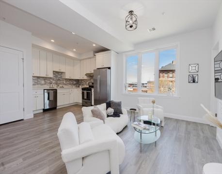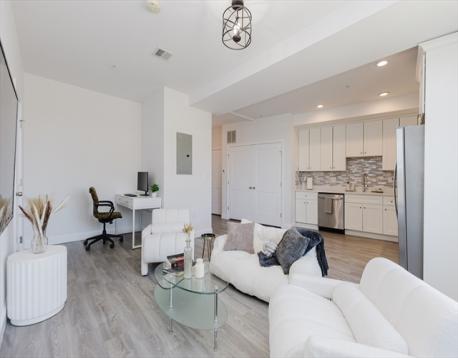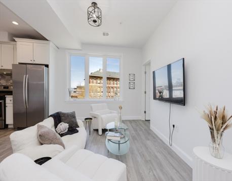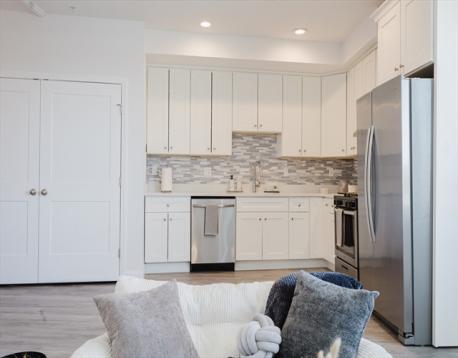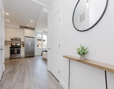 Bright and beautifully finished penthouse-level 1-bedroom condo offering modern comfort in an elevator building. This top-floor home features an open-concept layout with oversized windows, high ceilings, and abundant natural light throughout. The sleek kitchen is outfitted with stainless steel appliances, generous cabinetry, and stylish finishes, flowing seamlessly into the spacious living area ideal for relaxing, entertaining, or working from home. The bedroom offers excellent light and closet space, while additional highlights include central air, in-unit laundry, and access to common outdoor space. Conveniently located near the Newmarket Commuter Rail, South Bay Center, major bus lines, highways, shopping, and dining, this is an ideal opportunity for easy city living in a well maintained newer building. Fully repainted + Brand new Kitchen backsplash done in March.