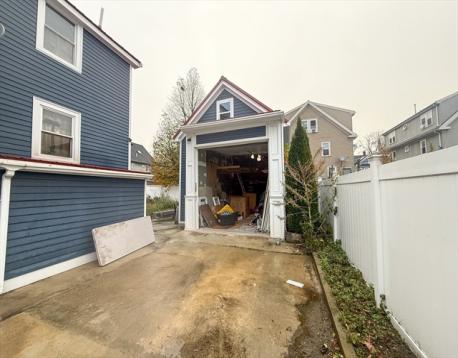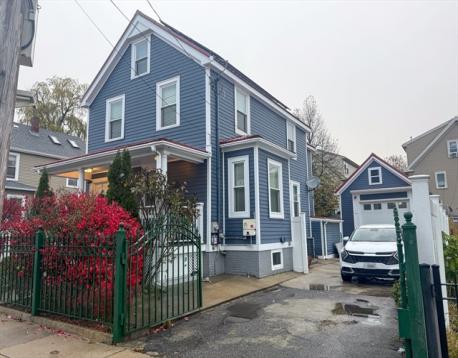 Beautifully updated Colonial with standout curb appeal, featuring a navy exterior, white trim, inviting front porch, and mature landscaping behind a decorative wrought-iron fence. Inside, enjoy hardwood floors, generous room sizes, and an updated kitchen with granite countertops and stainless steel appliances. The refreshed full bath offers subway tile, granite vanity, and modern finishes. Bedrooms and hallways provide great light and flexible space for work, guests, or multi-generational living. A private driveway leads to a detached garage ideal for storage, hobbies, or future expansion. Fresh siding, updated windows, and a well-maintained exterior make moving in easy while still giving you the chance to customize and create your dream home. Close to parks, transit, shops, and all that Dorchester offers—this is a rare blend of charm, updates, and potential.