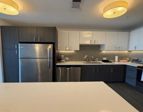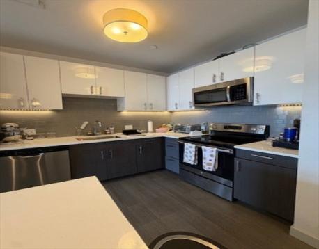 99 Tremont - constructed in 2018 , is in the prime Brighton location, 5 min to Boston landing, Mass Pike (Rt 90), Roger's park, new Harvard Science and Engineering complex in Allston, Trader Joe's and Whole Foods, 3 buses stop right next to the building. This is a luxury building with elevators, on-site management, a fitness center, inner yard with grilling stations, a club lounge with a catering kitchen, a billiard room, a media room, bike storage, pet washing station. The top (5th) floor 2 bedroom, 2 bathroom residence with Central A/C, washer and dryer offers beautiful views of Brighton rooftops and tree covered hills. The open space design combines the living room with a well equipped kitchen, large central island as well as generous closets. The unit is upgraded with solid wood hardwood floors installed in both bedrooms. There is a storage room and 2 car parking spaces in the basement garage.