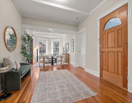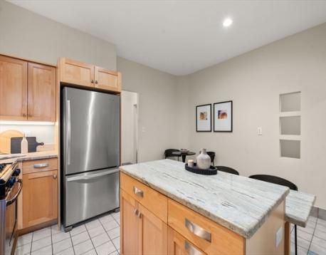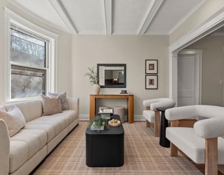 Coolidge Corner | Classic Brick Beauty with Sun-Filled Living. Timeless & elegant, this south-facing condo is in an ideal spot! Located on the 2nd floor this home offers 8RM, 4BR, & 2BA w/ 1,765 SF of beautifully maintained living space. A gracious foyer w/ a double closet, gleaming wood floors, & a striking high beamed ceiling sets the tone for a residence filled with light, warmth, and character. The inviting living room features a stunning bay window, while high ceilings lead seamlessly into a spectacular, entertainment-sized DR complete w/rich wood paneling, a fireplace, & a built-in cabinet. The remodeled cook’s kitchen is both stylish & functional, w/ stainless steel appliances, beautiful countertops, ample space for a table & breakfast bar seating. The primary BR boasts a renovated en-suite bath w/a large walk-in shower. Off the primary BR is a picturesque sunroom/office flooded w/ natural light. Coveted separate laundry room for side by side W/D. Why wait?!