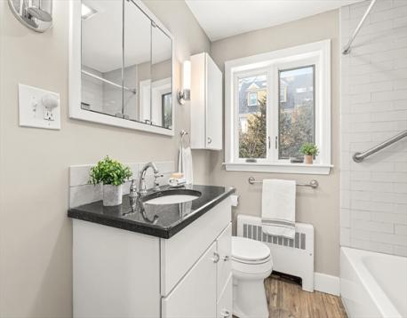 Hidden gem in prime Brookline location! Nestled on a quiet side street, yet conveniently located close to the vibrant shops and restaurants of Brookline Village, Coolidge Corner, the MBTA Green lines, Longwood medical area, and Lawrence School. This attached single-family home has been renovated throughout and offers a stunning cook's kitchen with Bosch appliances, breakfast bar and dining area. The kitchen opens out onto a covered deck and private fenced garden that provides a beautiful hidden sanctuary, with a professionally landscaped perennial garden. The first floor also features a living room with gleaming wood floors and fireplace and a renovated full bath. On the second floor you will find two generous bedrooms and a renovated full bath with high-end finishes. The basement has storage and laundry, and the attached garage is heated offering a flex space that could be used as a home gym, play space or office. This elegant urban oasis offers the best that Brookline has to offer!