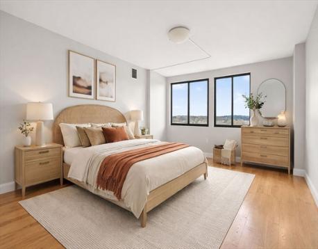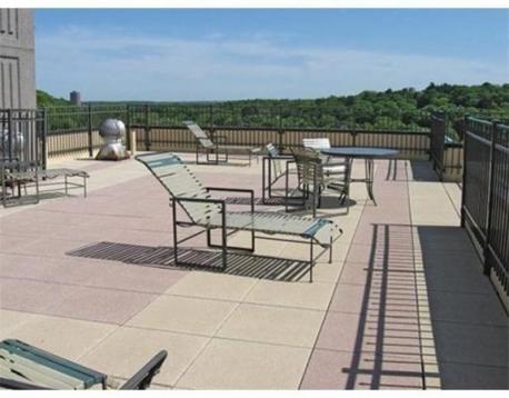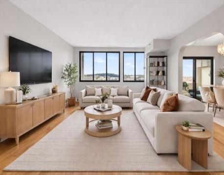 Regency Park, one of Brookline's most sought after addresses. 12th floor corner, sun filled and spacious, renovated unit with panoramic views all the way to Jamaica Tower in JP and Boston College. *Balcony with breathtaking sunsets* Open floor plan with a separate dining room and XLarge living room. Ample outfitted closets. Hardwood floors throughout. Deeded garage parking G2 space # 132 and extra storage in Storage Room 5. The building comes complete with concierge service, a year-round swimming pool, exercise room, library, pin pong room, courtyard, grilling areas, and more. Super convenient location. *All rooms are virtually staged*