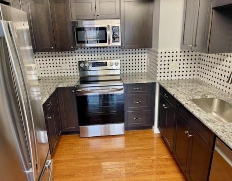 Perched high above the bustle of city life, this stunning one-bedroom condo with genuine hardwood floors has undergone a glamorous high-end renovation. Bathroom features "His & Her" sinks, granite counters, walnut vanities w/ generous storage, mother-of-pearl tiles & recessed lighting. Open-concept Living/Dining area creates a welcome space for lively entertaining. Enjoy elegant, carefree living at Brookline's most desirable full-amenity complex. Included: 24 Hr Concierge, 4-Season heated Pool w/ landscaped courtyard, Garage Parking, Guest Parking, Storage, Gym, Clubroom, Library & Roof Deck w/ Panoramic views! *Brand new Laundry rooms on every floor. *Just completed; a stylish renovation to ALL common areas; hallways, elevator banks, and both Lobby levels. *Wonderful pied--a-terre for the urban professional. *Effortless Living amidst the renowned Washington Square dining scene. *C-line train just outside your front door with EZ access to Longwood Med & downtown Boston.