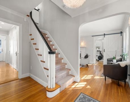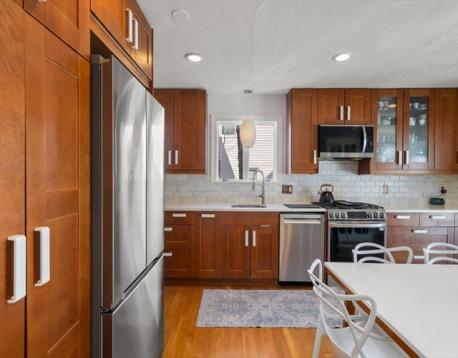 Sunny and beautifully maintained English Tudor on a picturesque tree-lined Brookline street. Thoughtfully updated and move-in ready, this home blends classic charm with modern improvements. The sun-filled eat-in kitchen features newer appliances (2025–2026) and opens to an enhanced backyard with updated hardscaping, fencing, and hot tub. The main level offers a formal dining room, spacious living room with fireplace, flexible office/bonus room, half bath, and dedicated laundry. Upstairs includes four bedrooms, a newly added primary bath (2025), and a fully renovated family bath (2025). The lower level features updated flooring (2022) and a full bath (2022). Recent updates include boiler (2023), heating system (2022), mini-splits (2023), driveway resurfacing (2025), and more. Hardwood floors, central air, insulated windows, and a rare direct-entry two-car garage complete this offering. Convenient to parks, shopping, and dining.