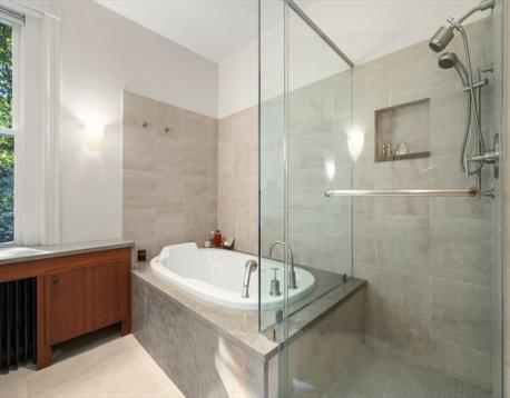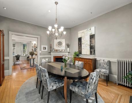 Sophisticated Pill Hill residence in a Romanesque puddingstone row house designed by Henry Ives Cobb c. 1887, blends beautiful period detail with discerning finish and design offering recessed windows with built-in shutters, five original tile fireplaces, and impeccable renovations. First floor features an elegant foyer, living room with custom bookshelves and bay window, dining room with French doors opening to original wrought-iron balcony with stairs to patio and fenced garden, and updated galley kitchen with granite countertops and glass tile backsplash. The second floor has a primary suite with double vanity bath, shower, fireplace, walk-in closet, and office. A library/bedroom with bay window completes this level. Third floor: two bedrooms, studio with skylight, and four-piece bath. Lower level: versatile living space with full bath, laundry/storage. Three parking spaces. Excellent location near parks, schools, âTâ, Brookline Village, Longwood Medical Area, and Downtown Boston.