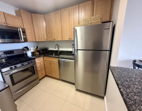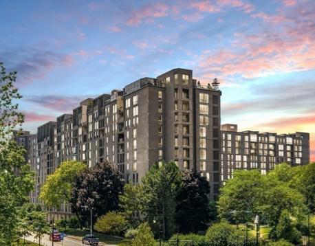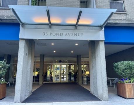 Enjoy pleasing park + pond views from top (12th) floor 1 bed, 1 bath luxury condo at the Brook House. Tastefully renovated + in mint condition with recessed lighting, plenty of closet space + bamboo flooring. Gorgeous kitchen with maple cabinets, navy/rose granite countertops + stainless steel appliances (gas stove, microwave + Bosch DW). Pass through from kitchen with bar seating. Renovated bath with glacier tile surround, Grohe chrome hardware + adjustable control shower head. Central air conditioning + heated garage parking (space #319). Building: Elevator, 24 hour security/concierge, pet friendly, non smoking, pool, herb garden, table tennis, golf putting green, basketball + pickleball court, gym, weight room & outdoor BBQ grilling areas. Conveniently located near Brookline Village, Coolidge Corner, Jamaica Pond + trains (D/E greenlines) to Longwood Medical area + downtown Boston. A must see!