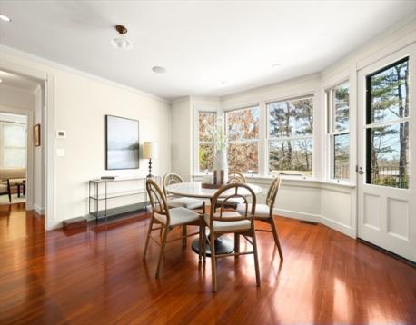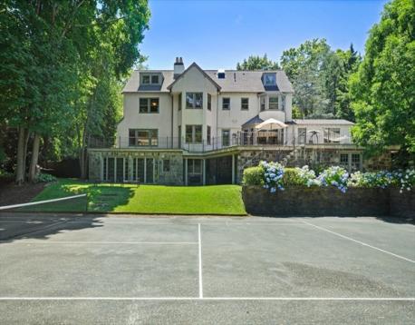 An exquisite stucco residence nestled in the coveted Chestnut Hill neighborhood of Brookline. Its hilltop location with stunning terraced grounds provides seasonal views of the reservoir and iconic Boston skyline. This property boasts a clay tennis court and completely renovated interior with a geothermal HVAC system and heated 3-car garage. The cook's kitchen with breakfast area and French doors lead to an elegant stone patio and backyard oasis. The spacious formal living and dining rooms, wood paneled library and family room complete the elegant main level. The seven bedrooms include a primary suite with dual bathrooms and dressing rooms. The third floor has a generous two-bedroom guest suite. The unique walkout lower level is extraordinary and features the original carriage house restored with an illuminated brick barreled ceiling, an unparalleled stone entertainment room and additional bedroom suite. Experience luxury living with the convenience of Boston's vibrant lifestyle.