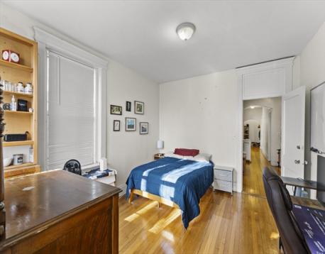 Walk to everything, shops, Trader Joes, Coolidge Corner Movie theater, BU, T in a 5-room condo, two bedrooms, living room, kitchen, and a bonus 5th-room 3-season enclosed porch. Private storage locker and free laundry in the basement. High ceiling, arched doorways, hardwood floors throughout. Unit will need updating, but the best value is in Coolidge Corner or Brookline. First showing at open house on Sunday, February 15, from 1-2:20 PM. A historic building where the future king of Thailand lived. Please see the photo in the listing.
