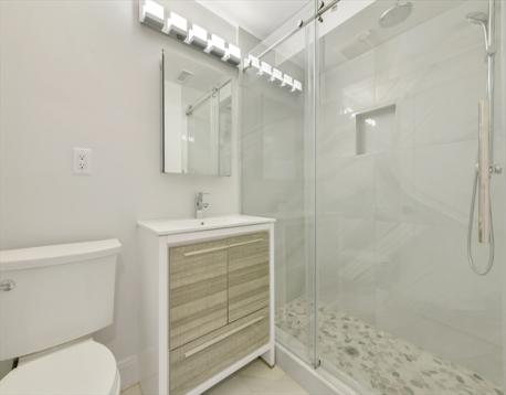 Welcome to a meticulously rebuilt modern gem in Brookline! Completely reimagined from the studs, this open-concept home features 4 bedrooms, 4 full baths, and a convenient first-floor powder room. The main level flows effortlessly, with a spacious family/living room, dining area, and a chef's kitchen equipped with Thermador appliances, sleek handle-less cabinetry, quartz countertops, and an entertainer’s island. Upstairs, a serene bedroom with an ensuite offers privacy and comfort. The lower level reveals a luxurious primary suite with a spa-like bath and walk-in closet, two additional bedrooms, and a family/playroom. Outside, you'll find a beautifully landscaped front yard and a peaceful, fenced backyard with a patio—perfect for morning coffee or alfresco dining. Located just a block from Baker School and moments from playgrounds, parks, a library, and premier shopping at The Street and Chestnut Hill Mall, this home offers style, function, and unmatched convenience.