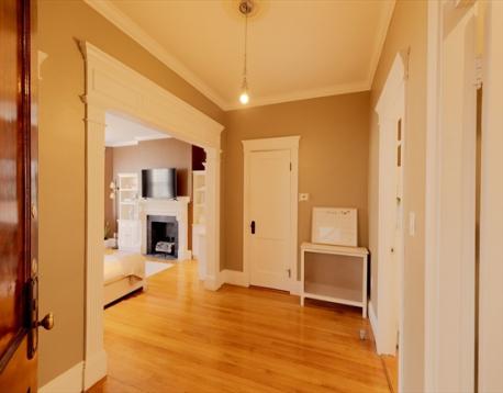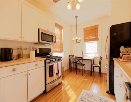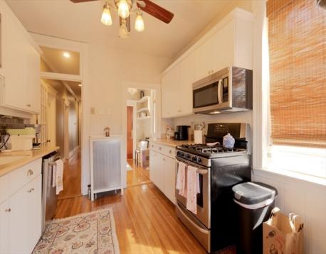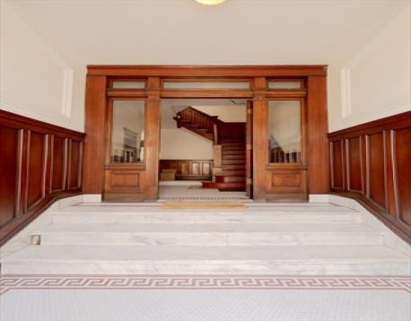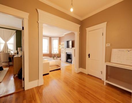 Prime location! This is an exquisite Manhattan-style brownstone property that is tucked into a beautiful tree-lined street with city views. Walking distance to all that city living can offer - walking distance to Brookline gem, Rose Garden and Park. Attractive second-floor condo w/ impressive period detail and carefully designed upgrades. Great floor plan offering plenty of room for entertaining and comfortable living, living room w/ gorgeous fireplace, mantle and restored bookshelves, crown moldings, and bay window. Two spacious bedrooms with ample closet spaces and a walk-in closet.Hardwood floors throughout. The private deck surround by trees will offer you sanctuary from the hum of city life. One deed parking space.