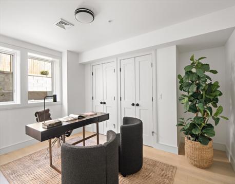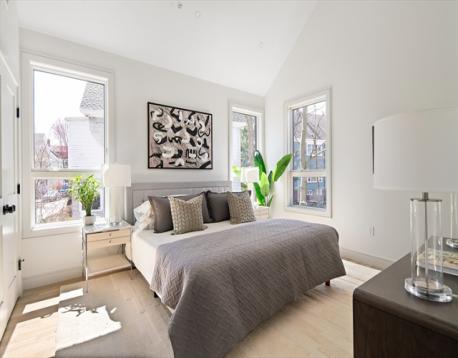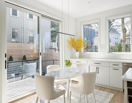 Sun drenched and impeccably crafted, this newly built home offers refined modern living with elevated finishes throughout. The main level features high ceilings, an open living and dining area, and oversized glass doors leading to a private deck and landscaped yard, ideal for indoor outdoor living. The kitchen is outfitted with custom cabinetry, quartz countertops, and a Thermador appliance suite. A modern staircase leads to a generous primary suite with a private bath and dual closets, along with two additional bedrooms and a full bathroom. The lower level offers a spacious bedroom or office, a full bath, a family room with walk out access to outdoor space, and a laundry room. Designed for comfort and efficiency, the home includes a heat pump system, ERV ventilation, and foam insulation. Ideally located near Fresh Pond and Huron Village, minutes from Sofra, Intelligentsia, and public transportation to Harvard Square and Cambridge destinations.