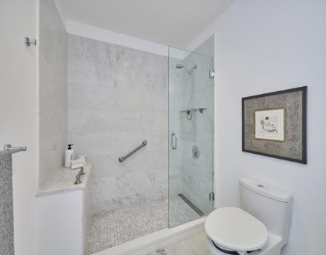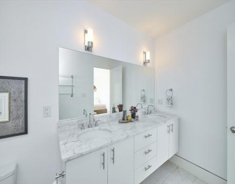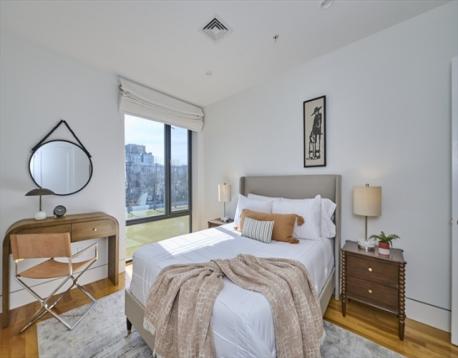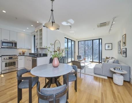 This sophisticated 2 bedroom 2 bath condo offers an exceptional Cambridge lifestyle . Located in a striking boutique building over looking a park, it offers an elevator, direct access garage, and heated driveway. A sleek, efficiently designed kitchen with custom cabinets, tile back splash and Jenn-Air appliances opens to a dining area accented by custom built-ins. The sunny living room features a wall of glass with sliders to your private terrace. Both bedrooms are tucked away and have large windows with views of the park. The en-suite primary bedroom offers a "spa like " marble bath with double sinks and over-sized shower. The 2nd bathroom has a tile shower and single sink vanity. In addition, there is a full-sized stackable laundry and utility closet in the foyer. A private storage closet as well as bike storage in the garage complete this special condo. Prime, vibrant location, walk to Tech Sq. MIT, Harvard ,Central Sq., The Charles River with Boston a bridge away & dog park.