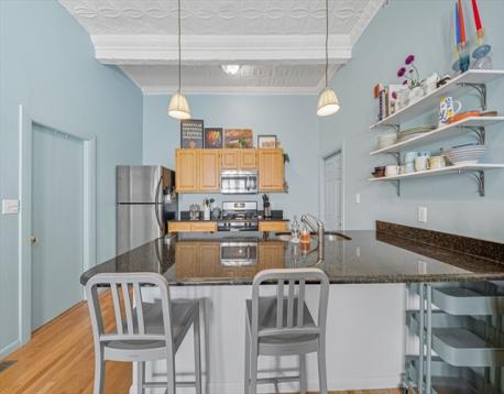 Welcome to 183-185 Rindge Ave Unit 1, a Cambridge condo that perfectly blends historic character with modern convenience. Set on the first floor, this thoughtfully maintained home offers a warm and inviting living room highlighted by a beamed ceiling and elegant crown molding. The open floor plan creates seamless flow into the dining area and a showpiece kitchen designed for both function and style. A generous island, bar seating, and peninsula provide ample space for cooking, entertaining, and casual dining, all enhanced by beautiful stone countertops. The crown molding continues throughout, tying the home together with timeless sophistication. The spacious bedroom serves as a peaceful retreat with refined finishes. Additional features include a private outdoor porch and private laundry. Ideally located near parks, shops, restaurants, and transit, this residence offers a rare combination of charm, comfort, and accessibility in one of Cambridge’s most desirable neighborhoods.