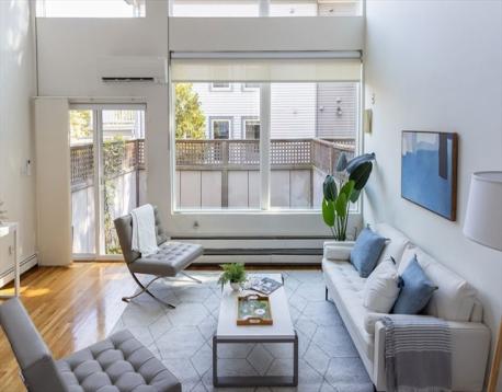 2 Ellery Square is a delightful sunlit attached single-family townhouse in the heart of Mid-Cambridge, with over 1900 square feet of contemporary-style living space. Each of its four bedrooms has its own level; two have en-suite full bathrooms. The design embraces nature in the city: oversized windows let morning and afternoon light stream in, the two-story living room overlooks a private patio, and the main bedroom connects to a sunny top-floor deck. Inside, clean lines and an open plan give a sense of spaciousness, with hardwood floors in the main rooms and new carpeting on the stairs. Either or both of the two middle bedrooms could make an excellent office, study, or media room, while the downstairs bedroom suite would be ideal for a guest or nanny. The property is perfectly located, not far from Harvard, Central, and Inman Squares and across Broadway from the award-winning Cambridge Public Library. Attached garage parking, a well-run homeowners' association.