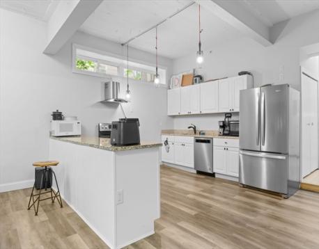 Welcome to this charming condo in Everett! Take a look of the open-concept design seamlessly connects the living, dining, and kitchen areas, providing an ideal setting for both relaxation and entertainment! Enjoy the soaring 9'+ foot vaulted ceilings with exposed beams, custom track and pendant lighting, and recessed lighting! The heart of the home is the spacious kitchen with stainless steel appliances, a granite island bar, birch countertops, and ample cabinet space. This 4-bedroom, 2-bath home includes a fully tiled Japanese-style slate soaking tub and shower, plus 1 garage parking spot. Conveniently located just 5 mins away from Whidden Hospital, close to Everett High School and Glendale Park, easy access to public transportation Rt 1 and Rt 16, and just a few minutes to Boston and Encore Casino! Don't wait! Come see us at the open house!