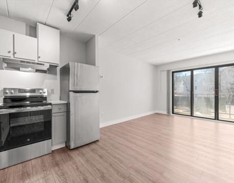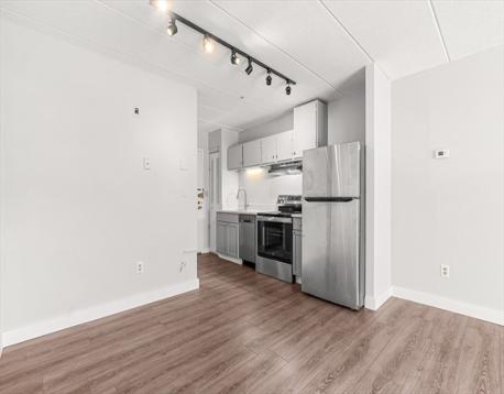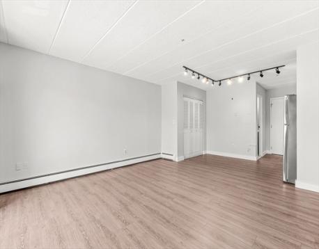 Southwest-facing studio unit with brand new stainless steel kitchen appliances, updated flooring, and bathroom with new vanity, lighting, and toilet. Rare balcony that runs the full length of the unit. Heat and hot water included in the condo fee. 1 unassigned parking space and extra storage. Common laundry on every floor of the building and convenient guest parking.