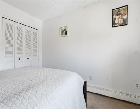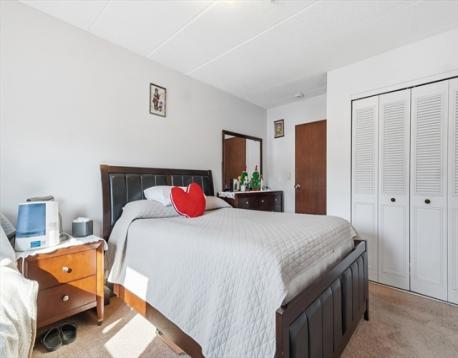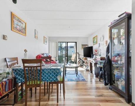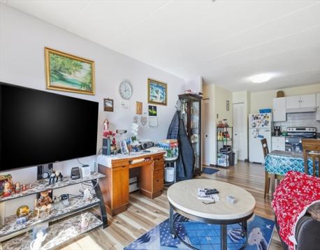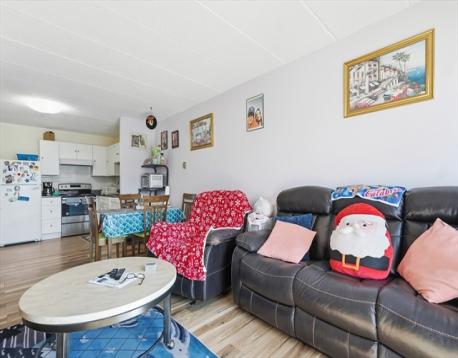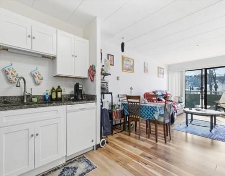 Upper-level one-bedroom at Regency Condominiums featuring a well-proportioned layout, abundant natural light, and a private balcony overlooking the courtyard. The living area offers an open floor plan with space for dining, vinyl flooring, and sliding doors that bring in steady sunlight. The kitchen is finished with granite countertops, upgraded cabinetry, and durable vinyl flooring, creating a clean and functional workspace. A generously sized bedroom includes ample closet space, and the full tiled bath is neatly maintained. Elevator building with common laundry, deeded off-street parking, and an association fee that covers heat and hot water—an added value. Brick construction, professional landscaping, and close proximity to public transportation, shopping, major routes, and the T make this a solid opportunity for low-maintenance living or investment.