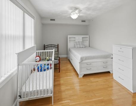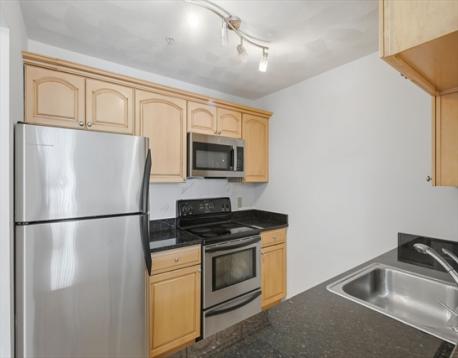 Enjoy turnkey living in this top-floor corner condo overlooking manicured gardens and a peaceful courtyard, and decorative garden lighting. This sunlit 2-bedroom, 1-bath home features an open-concept living and dining area with hardwood floors. The modern galley kitchen offers Frigidaire stainless steel appliances, granite counters, a pantry, and a dishwasher. The primary bedroom includes a walk-in closet; the second bedroom is ideal for guests or a home office. Relax in the bathroom with a jetted tub. Additional perks include an in-unit stack washer/dryer, CENTRAL AIR, and TWO DEEDED PARKING APACES. Move-in ready and minutes from Boston, shopping, public transit, and beaches—see it today!