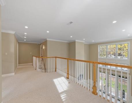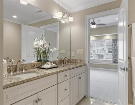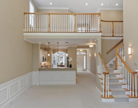 Simply stunning describes this “Buckingham” end unit in the desirable 55+ maintenance-free Windsor Estates community. From the sun-filled two-story foyer, you are welcomed by refined details throughout, including crown molding, wainscoting, 18-foot ceilings in the living room, and a coffered ceiling in the first-floor primary ensuite. The elegant dining room features a tray ceiling. The chef’s kitchen offers stainless-steel appliances, granite countertops, an oversized breakfast bar, and two pantries. Enjoy the warmth of a gas fireplace in cooler months and a private walk-out patio in warmer seasons. Upstairs, a spacious loft overlooks the living room and leads to a second primary suite with a spa-like marble bath and a dedicated home office. The lower level, equipped with electric baseboard heat and outlets, provides potential for expansion. Ideally located near MarketStreet, shops, restaurants, Whole Foods, golf, and major routes with easy airport access. A rare offering!