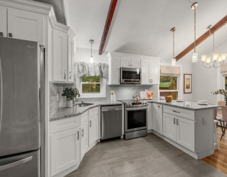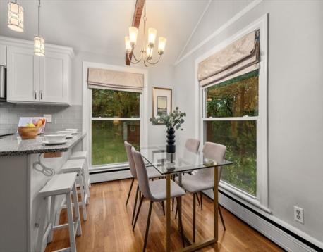 Tucked on a quiet street surrounded by mature trees, this move-in-ready single family offers a rare combination of space, style & privacy with a country feel just minutes from Boston. The 2020 kitchen shines with stainless appliances, granite counters, breakfast bar & open flow to the living & dining areas accented by 12-foot vaulted ceilings, exposed beams & architectural detail that feels like a design magazine spread. Three spacious bedrooms, newer windows & gleaming wood floors complete the main level. The finished lower level adds a fireplace, full bath, office, bedroom & easy potential for an in-law suite or creative studio. Beyond the doors awaits a private 1.29-acre retreat with lush lawn, gardens, stonework, deck & mature landscaping, perfect for summer BBQs, fall fires, or gardening. With two commuter rail stations nearby & quick access to Route 1, this home delivers sophistication, serenity & style, offering a peaceful escape with every modern convenience.