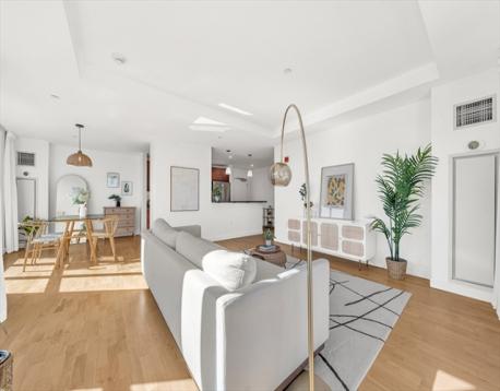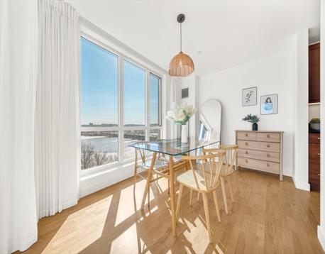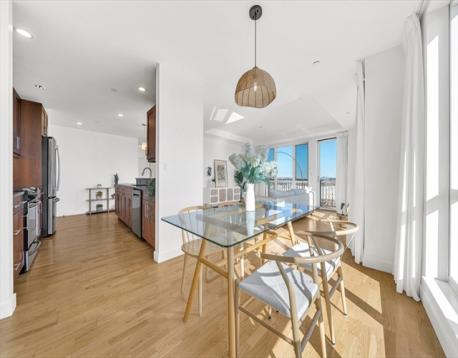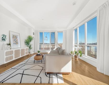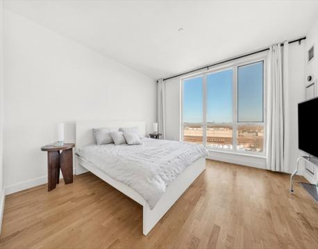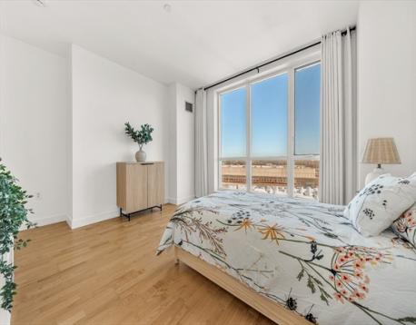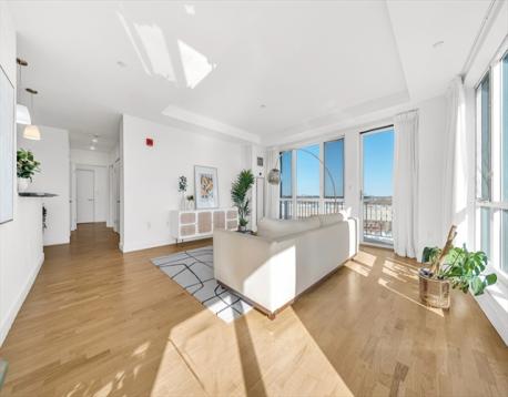 Rare 7th-level, 1,291 sqft corner condo at Skyline at Station Landing. Filled with natural light from floor-to-ceiling windows, with views of Mystic River, Boston, Wellington Marina, and Encore Casino. Open living, dining, and kitchen with private balcony. Kitchen features stainless steel appliances, cherry cabinets, granite counters, and bar seating for three. Two bedrooms, two full baths (renovated 2023), central air, primary walk-in closet, in-unit laundry. Amenities: concierge, lobby, 24-hr gym, conference room, lounge, terrace, shared kitchen, Wi-Fi. Near Shops at Station Landing and garage with covered bridge to Orange Line. Includes secure garage spot, private storage, heat and hot water. Pet-friendly, built 2007, move-in ready.