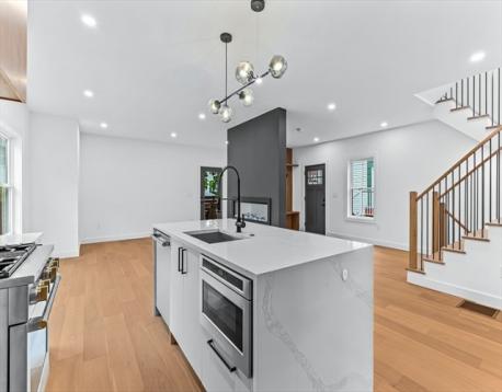 Welcome to 11 Bonner Ave #2, a beautifully designed three-level condo by the Treetop Group in the heart of Medford. This 4 bed, 3.5 bath home features wide-plank hardwood floors, soaring ceilings, and custom finishes throughout. The open main level offers a chef’s kitchen with waterfall quartz countertops and premium appliances, a spacious living area with an electric fireplace, and a built-in storage nook by the entry. Upstairs, the top-floor primary suite impresses with a walk-in closet and spa-like bath with soaking tub, tiled shower, and double vanity. Two additional bedrooms, a full bath, and laundry with custom storage complete the second level. The finished lower level offers a guest suite or home office with a full bath and wet bar. Enjoy a private fenced backyard, exclusive driveway access, and close proximity to I-93 and Assembly Row where there are many shops & restaurants. A perfect blend of style, comfort, and convenience.