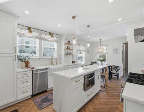 Step into this Completely Renovated Colonial where classic charm meets modern design. Welcoming foyer & partially open staircase, set the tone for the home’s character. 1st floor half bath w/custom finishes for convenience. Sunlight pours into the LR through oversized windows, highlighting hardwoods, beamed ceiling, fireplace,&built ins. Just beyond is the bright sunroom offering the perfect place to relax. Stunning, high-end kitchen w/custom cabinetry, quartz&marble surfaces, oversized center island, pantry w/custom shelving is the heart of the home & magazine worthy! Dedicated mudroom for rainy spring days. Primary suite includes walk-in closet&spa like bath w/heated floors. Part fin basement & attic offers room for expansion. Heated garage is currently used as home office/gym w/additional parking for 2 cars outside. Fenced yard provides privacy & perfect backdrop for summer entertaining. Close to walking trails&an easy commute to Boston, this home is a SHOW STOPPER!