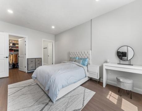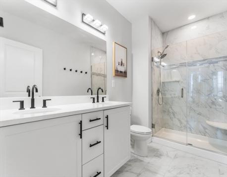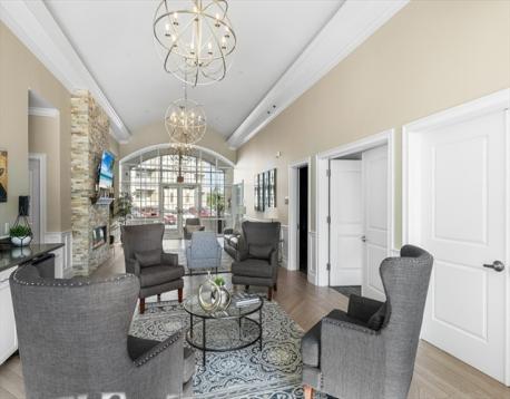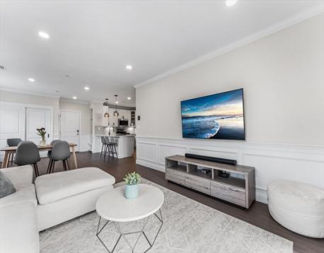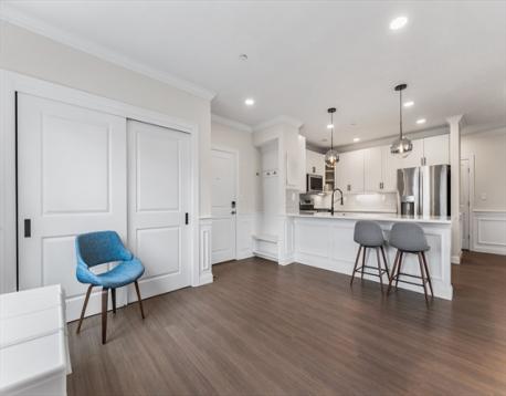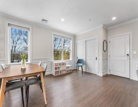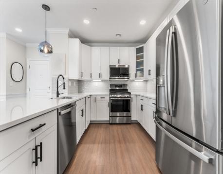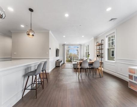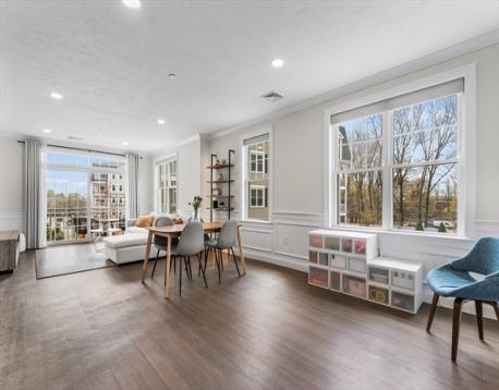 Pristine 2+ bedroom corner unit at Wellington Woods! This elegant residence features impressive architectural details, sleek style, high ceilings & abundant natural sunlight with a private deck accessible from both the living room & bedroom. Special features in unit B209 (in the Barclay building) are an office area with door for fantastic flex space; primary suite with double vanity quartz countertop in ensuite bathroom & custom walk in closet; view of the swimming pool; garage parking & 1 open air parking spot steps from the front door & additional storage. This superb location is on public transit & a short distance to Assembly Row, Station Landing & the Wellington T Station. Amenities include clubhouse, indoor & outdoor gathering areas, co-working spaces, fitness center, private theater, gated dog park, sport court, grilling area, fire pit terrace, pool, children’s playground, EV charging stations & underground bike storage. Pets welcome.