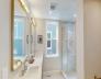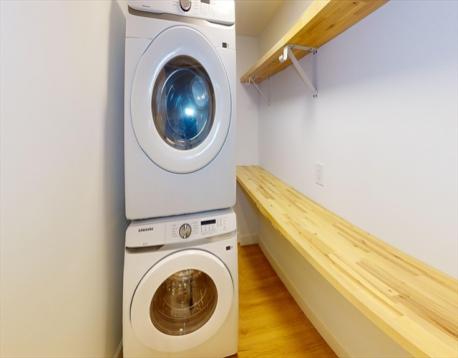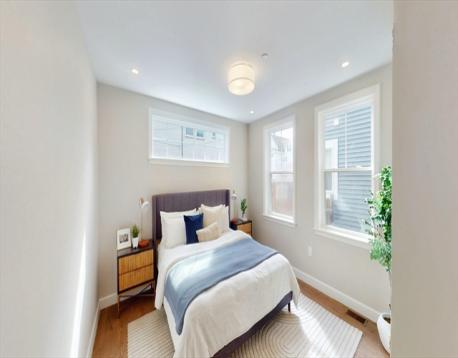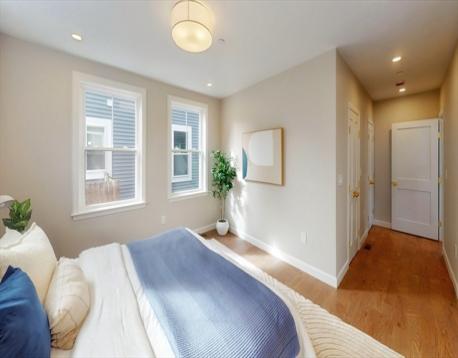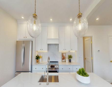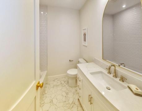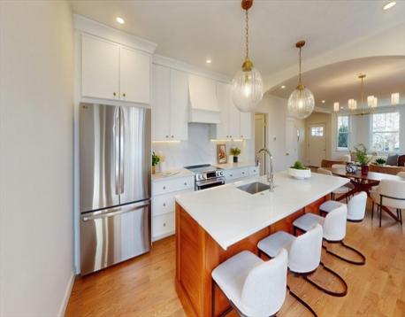 Unit 1 at 411 Salem St is a fully reimagined two-level residence offering over 2,000 SF with the scale and presence of a single-family home. Custom archways frame the main living spaces, creating a sense of arrival and character. The kitchen features a walnut island with beverage cooler, full-height Calacatta quartz backsplash, paneled hood, and ceiling-height cabinetry. A marble-surround fireplace with flanking built-in bookshelves anchors the living room. A designer powder room and mudroom with custom bench and millwork complete the main level. The primary suite is positioned for privacy with rear-facing exposure, walk-in closet, walk-in shower, double vanity, and timeless finishes. The lower level extends the living space, adding two bedrooms, dedicated office with closet, full bath, laundry, and family room. Built as a high-performance, all-electric home designed for comfort, with deeded parking, exclusive side yard, and private entries, steps from neighborhood shops.