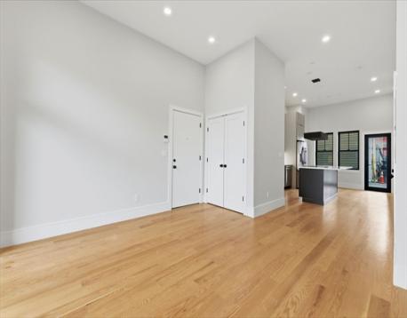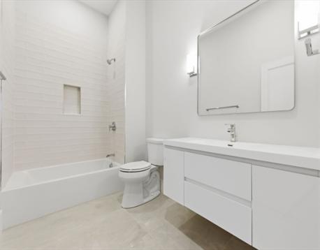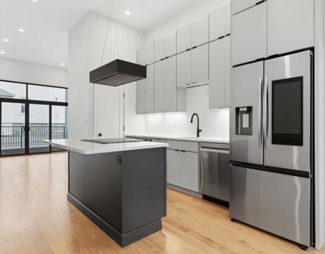 Welcome to The Doherty West Medford, where contemporary design meets modern convenience. This boutique 9-unit condominium complex offers thoughtfully designed residences with stylish finishes throughout. This exceptional ground-level 2-bedroom, 2-bath home features a private patio and its own private exterior entrance leading directly to one deeded parking space. The sleek kitchen is outfitted with gray cabinetry, an elegant hexagon tile backsplash, Samsung appliances including a touchscreen refrigerator, and a center island with an induction cooktop and sophisticated hanging hood. A ground-level café adds everyday convenience right outside your door. Ideally located just 0.1 miles from the West Medford MBTA station, this home offers easy access to public transportation, local restaurants, shops, and parks. With major routes nearby, commuting to Boston and surrounding communities is simple. Nearby amenities also include the Middlesex Fells Reservation and Tufts University.