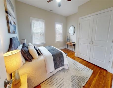 OPEN SUNDAY 12-1:30 HISTORIC Medford Square neighborhood is home to this ULTRA modern two level, condominium suite in renovated 1850 home that was built to overlook the Mystic River. Mr. Darius Greene, flour merchant, would raise his family here. Gut renovation and restoration included Wood clapboard exterior, open air porches, Oak flooring with inlaid Mahogany detail, wrapped up with ULTRA modern decor like 2 custom tile, Full bathrooms, White Shaker Cabinet eat in kitchen with ample granite counters and stainless steel appliances. 20 ft living room on opposite side of the home from the sleeping areas- all with tons of closet space!. Private, Upper level, Primary Suite with wide, custom tile shower. Private deck overlooking the yard. 1 car garage parking PLUS 2 off street parking spaces. Fenced yard and shed. This beauty lives in a CHARMING neighborhood, near restaurants, Chevalier Theater, Route 93 access, steps from Mystic River recreation and the bike path. Walk Score of 87