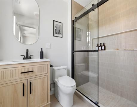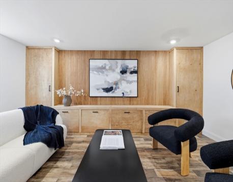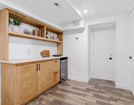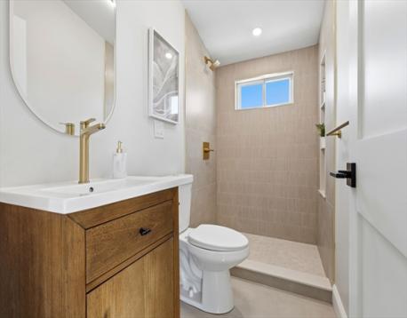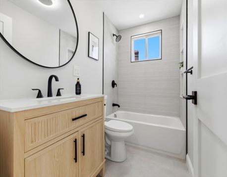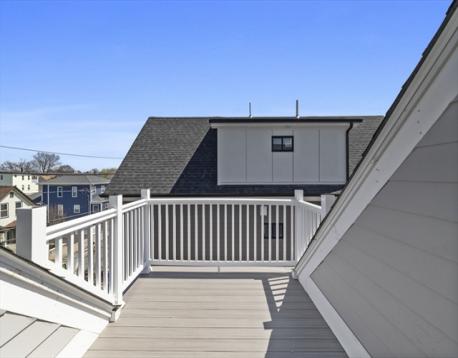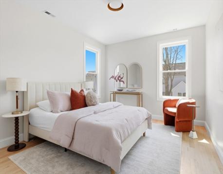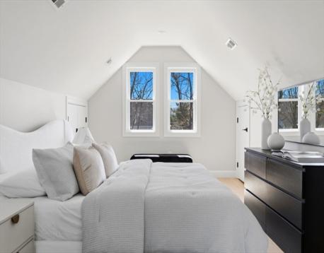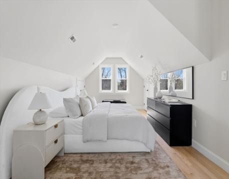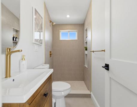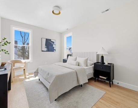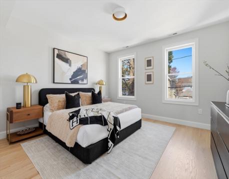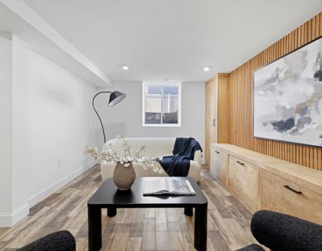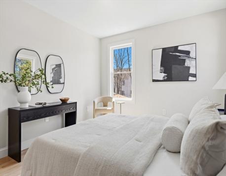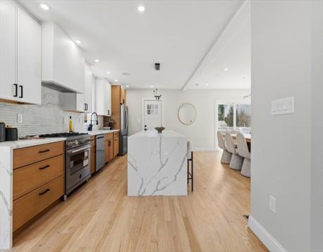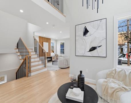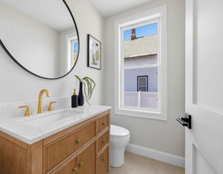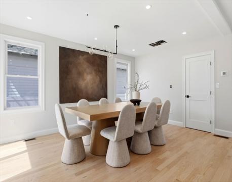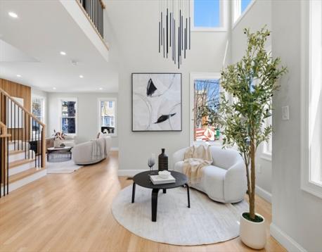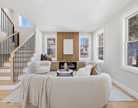 Fully renovated single-family home offering four levels of thoughtfully designed living. The main level opens into a bright living area anchored by a built-in media wall with storage, flowing into an open-concept kitchen with Calacatta quartz countertops, a waterfall island, two-tone cabinetry, & pendant lighting. White oak hardwood floors & recessed lighting run throughout, while a double-height seating area with a statement chandelier brings in natural light & creates a striking focal point. The second level includes a junior suite with a walk-in closet & ensuite bath, along with 2 additional bedrooms, a full bath, and a dedicated laundry room. The top floor offers a private primary suite with an office, walk-in closet, ensuite bath, & deck. The lower level features a family room with a dry bar & built-in bench. A private backyard, one garage spot, & off-street parking complete this home. Located with access to I-93, Route 28, Assembly Row, and Wellington Station for easy commuting.