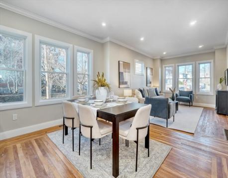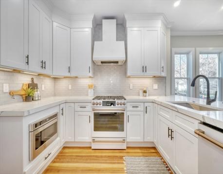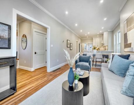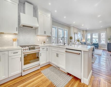 Walkability, convenience, and luxury first-floor living come together in this beautifully renovated townhouse. Mudroom with built-in bench and farmhouse detail, open-concept living, dining, and kitchen area with 9’ ceilings, recessed lighting, elegant moldings, and abundant natural light. Chef’s kitchen features a large double-thick quartz island, Café white appliances, custom wood hood, stylish hardware, and hardwood floors. The first floor also offers a dedicated laundry room, direct access to a private deck, two generous bedrooms with excellent closet space, and a full renovated bath with high-end finishes. The expansive lower level includes a large family room, an additional bedroom and a gorgeous full bath with designer tile and fixtures perfect for extended family, a home office, gym, or bonus living area. Deeded garage space and extra tandem parking. Walk to Oak Grove, steps to the commuter rail, shops, restaurants. Luxury and convenience in one perfect package.