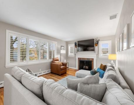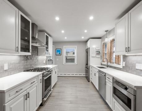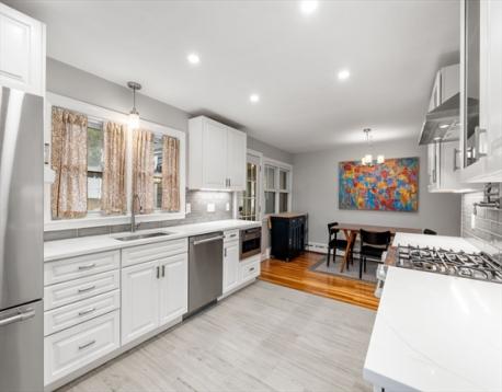 Sun-filled & charming, this beautifully updated ranch sits on a quarter-acre lot in Melrose. The inviting living room features a wood-burning fireplace, hardwood floors, & a custom bar w/beverage center & wine fridge. The kitchen offers quartz countertops, custom cabinetry, stainless steel appliances, & a dedicated dining area. A heated-floor sunroom off the kitchen provides an ideal space for entertaining or play. Three bedrooms with ample closet space and a renovated full bath with a frameless glass shower complete the main level. The lower level includes a finished basement space with oversized family room/office, an additional bedroom, newly renovated laundry room, & a full bath. Additional amenities include a fenced yard with mature landscaping & new patio, new A/C, heat, & hot water tank, custom blinds & shutters, & a garage. Located minutes from Melrose’s vibrant dining & shopping options with easy access to Route 1 & the MBTA bus line, this exceptional home is not to be missed.