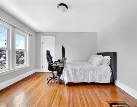 If walkability is what you’re looking for, this is the one. This Philadelphia-style townhome offers the space and feel of single-family living with the charm of period detail and the convenience of a prime location. Step onto the inviting farmer’s porch and immediately appreciate the original, beautiful dental moldings and leaded glass windows. This upper-level unit spans two full floors and features an open floor plan ideal for entertaining. The white kitchen with stainless steel appliances and peninsula seating overlooks the dining area, creating a seamless flow. Large windows flood the space with natural light, and the private living room offers a comfortable retreat. With four bedrooms, two full baths, and a dedicated office space, there is room for everyone. Additional highlights include a shared rear deck, fenced yard, generous basement storage, separate utilities, and two-car tandem parking. A rare combination of charm, and convenience, this is a home you don’t want to miss.