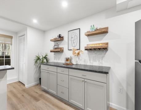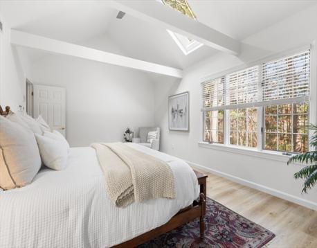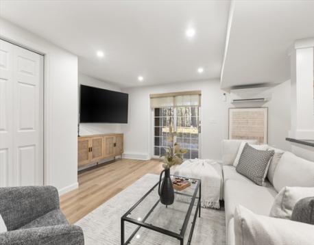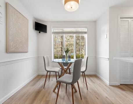 A RARE FIND AT FULLER POND VILLAGE! This RECENTLY RENOVATED 2-bedroom townhome offers exceptional privacy with serene wooded views from both the front and back. THE GENEROUSLY SIZED BACK DECK IS COMPLETELY PRIVATE—aside from the occasional turkey—and perfect for relaxing or entertaining. The kitchen features NEW STAINLESS STEEL APPLIANCES, quartz counters, updated flooring, and a bright dining area with picture window. Enjoy OPEN CONCEPT dining & living room space which includes a cozy wood-burning fireplace. A half bath and laundry complete this floor. THE FULLY FINISHED LOWER LEVEL includes an office, spacious seating area, full bar with sink, & a walk-out patio—also TOTALLY PRIVATE. Upstairs, is A PRIMARY SUITE WITH VAULTED CEILINGS and private bath, plus a second bedroom and full bath. BONUS: A FULL WALK UP ATTIC, perfect for storage, a gym, or more. All this comes with amenities such as Indoor / Outdoor heated pool, work out room, pickleball courts, clubhouse and more!