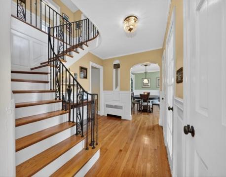 Welcome to this beautifully maintained and thoughtfully updated home, offering the perfect blend of comfort, style and convenience. Sun-filled interior features gleaming hardwood floors throughout, striking wrought iron staircase and a front to back fireplaced living room, ideal for both entertaining and everyday living. Formal dining room with custom built-ins and a beautfiully renovated kitchen with french door to a spacious deck create a seamless indoor-outdoor flow. Inviting family room offers additional space to relax and unwind. Mudroom with direct access to a heated two-car garage adds convenience. Second level includes a gracious primary suite with primary bath, a spacious second bedroom and an oversized third bedroom with cathedral ceilings and abundant storage. Third floor offers a versatile bedroom and bonus space, perfect for guests, office or playroom. Finished lower level with full bath completes four levels of living. Classic elegance and modern updates.