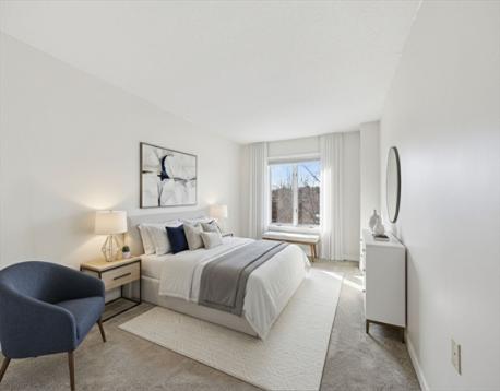 Rare top-floor condo at Rosemary Ridge! This thoughtfully laid out and newly painted home features a spacious central living room and full kitchen, flanked by 2 large bedrooms and 2 full baths. Primary includes a walk-in closet as well as an en-suite bath with double vanity and a partition pocket door to the toilet and shower offering extra privacy. The living room and primary each lead out through glass sliders to your own penthouse balcony. Both sliders and the second bedroom window let in natural sunlight due to their southern exposure. In-unit laundry, 2 zones of heat/AC, and ample closet space complete the interior. Take the elevators down to your 2 deeded parking spaces or to the fabulous amenities including an in-ground pool, hot tub, locker rooms with saunas, gym, clubroom with kitchen, library, private storage, and concierge services. Convenient to public transport, Rosemary Recreation Complex, town library, and many other amenities and shops in Needham Center and Heights.