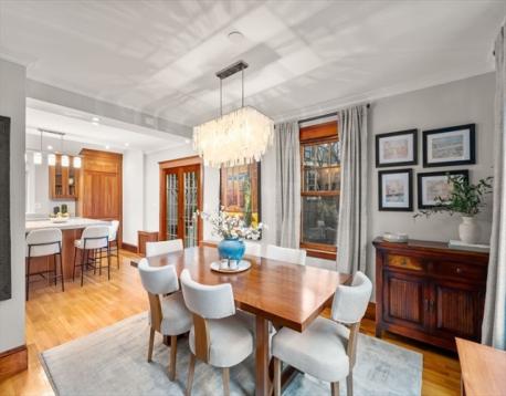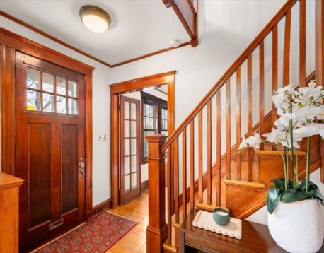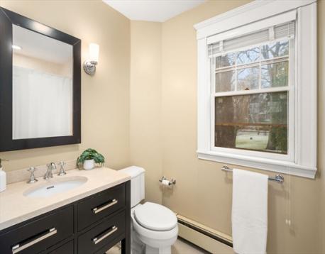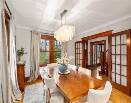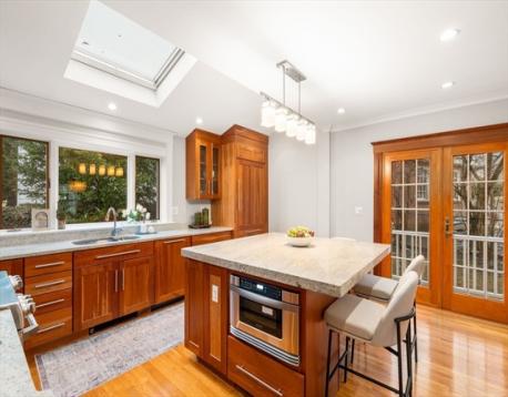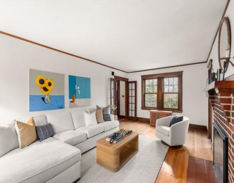 Situated on a quiet cul-de-sac, near the Newton Public Library and Commonwealth Avenue, this classic Colonial offers an exceptional blend of charm, light, and modern updates. The beautifully renovated kitchen features a center island and picturesque outdoor views, with French doors opening to a lovely patio for seamless indoor-outdoor living. The first floor includes an open kitchen and dining area, a stunning front-to-back living room with both eastern and western exposures for abundant natural light throughout the day, and a family room with an additional French door to the outdoors. Upstairs are three bedrooms, including a primary suite with a large walk-in closet, cathedral ceiling, three-piece bath, full size washer/dryer, along with a second updated full bathroom complete this floor. The basement offers ample storage and good ceiling height with potential for additional finished space. Garage parking plus additional off-street parking complete this special home.
