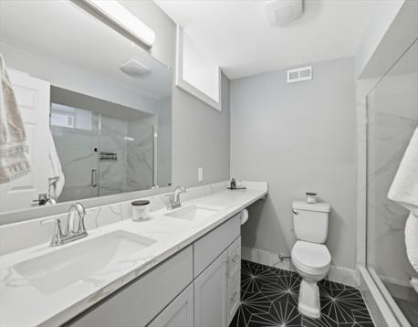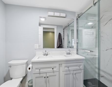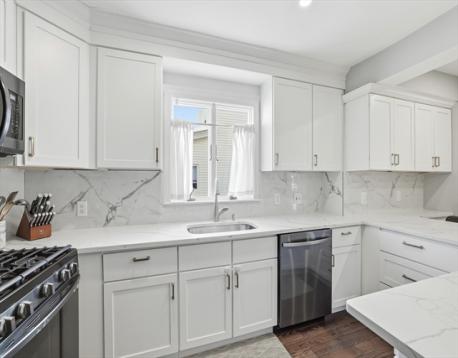 Just a few blocks from West Newton Center is this tasteful 2023 renovated condo. This 3 bed, 3 full bath duplex features 1,836+/- sq ft of living space that offers a perfect blend of charm and modern convenience. The heart of the home is the kitchen, boasting quartz countertops & quartz backsplash, gas cooking, stainless steel appliances and a sleek peninsula with seating for 6. Relax in the sunlit living room. The private dining area opens up to a deck and fenced yard, perfect for entertaining or a quiet retreat. An ensuite bedroom, an additional bedroom, and a full bath complete the main level. Descend to the lower level where a luxurious primary suite awaits, featuring a walk-in closet and a stunning bathroom with double sinks and a glass-enclosed shower. This home ensures comfort with wood flooring, central AC, in-unit laundry and 2 dedicated parking spaces. Prime location with easy access to shops, public transportation, restaurants and schools!
