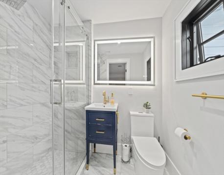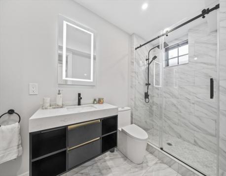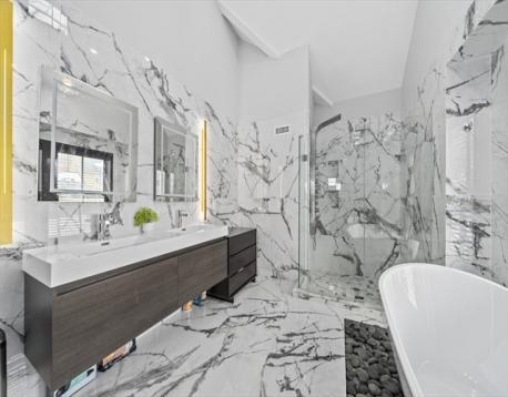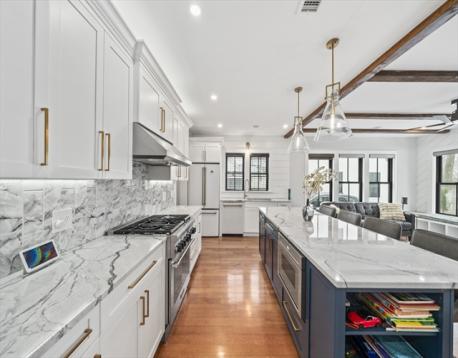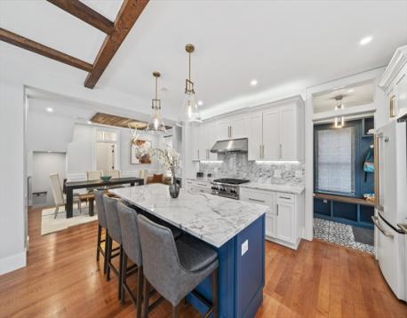 Ultra-chic design and high-end appointments give this newer construction home an unsurpassed modern flair. Architecturally rebuilt and restored, this Victorian-style home was re-designed for modern living, with an open floor plan and exquisite details. Painstakingly chosen design elements include herringbone shiplap, beamed ceilings, stunning designer lighting and window treatments, transom windows, large format tiled bathroom walls and gold-toned fixtures. Breathtaking primary bedroom with balcony and sumptuous primary bath - both with cathedral ceilings, and a grand central staircase, with exalted loft composition brings sunlight streaming through the center of the home. The kitchen is adorned with high-quality fixtures & excellent entertainment space, with a central island and seating for four. Stylish mudroom, elegant walk-in pantry, top level au pair suite, and lower level ADU quarters complete with wine cellar and wet bar. Garage parking and exclusive storage above. Private yard.